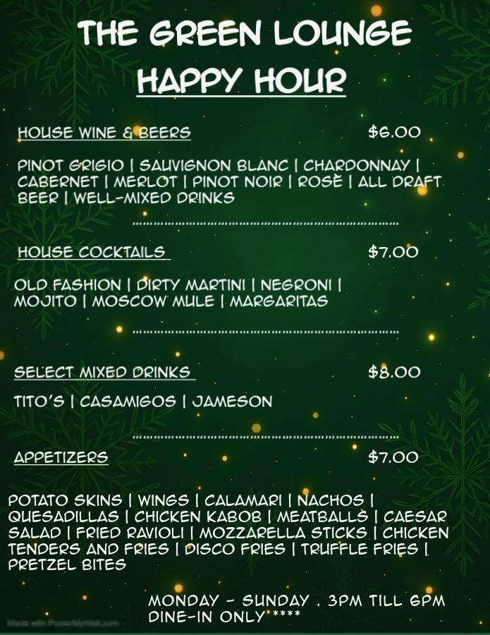 Host your next event at The Green Lounge. Our modern interior and versatile seating are ideal for birthdays, anniversaries, and corporate dinners. Pair delicious American dishes with handcrafted cocktails, hookah, and attentive service for a celebration your guests will love.